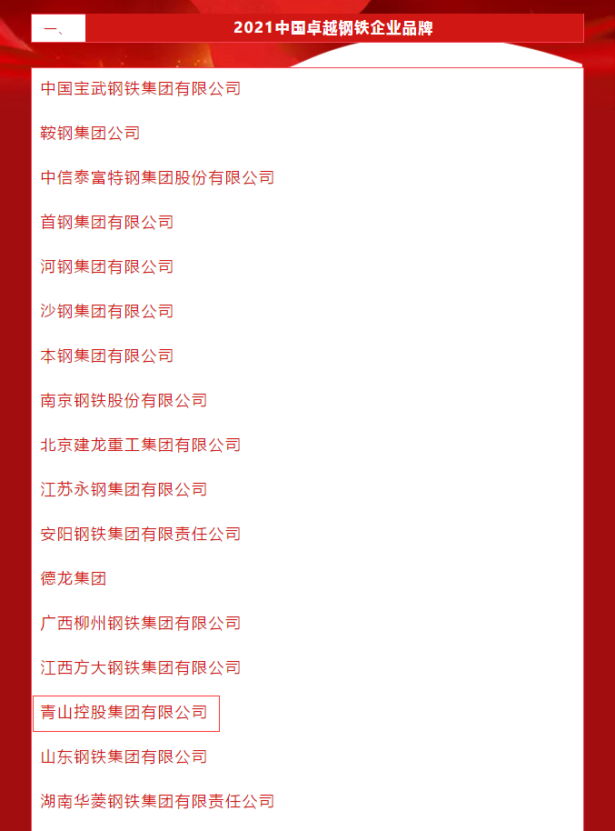 On May 10, the 5th Chinese Brand Day, China Metallurgical News released the 2021 China Steel Brand List. Tsingshan Holding Group Co., Ltd. was awarded” the 2021 China Excellent Steel Enterprise Brand” and “the 2021 China Special Steel Enterprise Excellent Brand”.